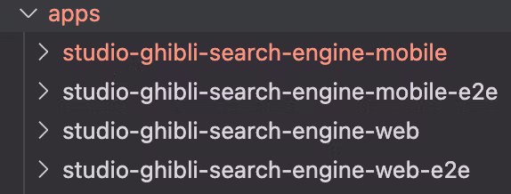 As a result of running the above command, you should now have two new folders under the apps directory: studio-ghibli-search-engine-mobile and studio-ghibli-search-engine-mobile-e2e